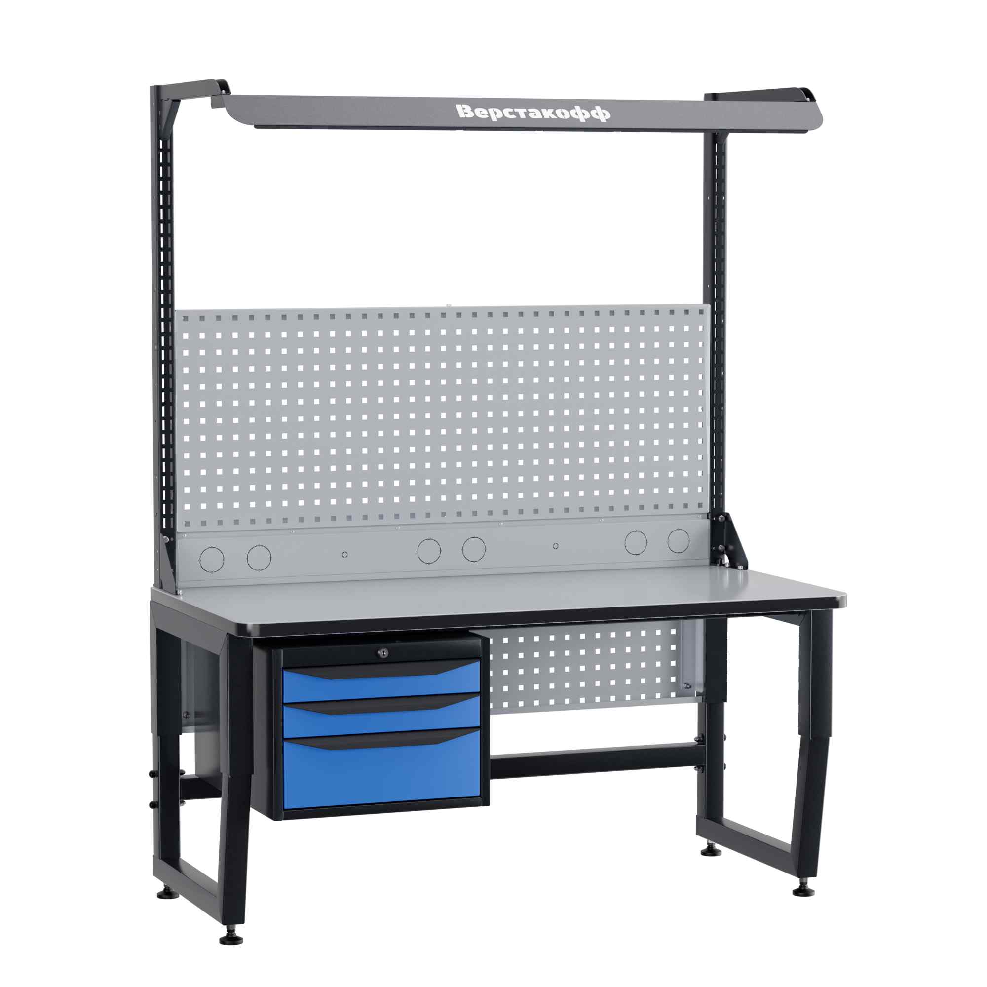 Для наилучшей освещенности при работе с мелкими электронными компонентами рабочее место комплектуется блоком освещения. В его составе - специальный промышленный светильник с необходимой цветовой температурой и световым потоком, обеспечивающим оптимальные условия работы. Блок освещения располагается над рабочей поверхностью на регулируемых (по высоте и по вылету) кронштейнах