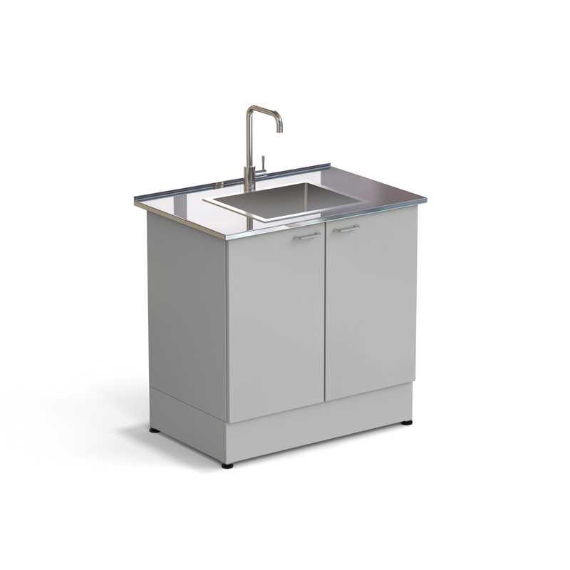 Стол-мойка состоит из металлического каркаса с установленными дверьми и комплекта сантехнических принадлежностей.