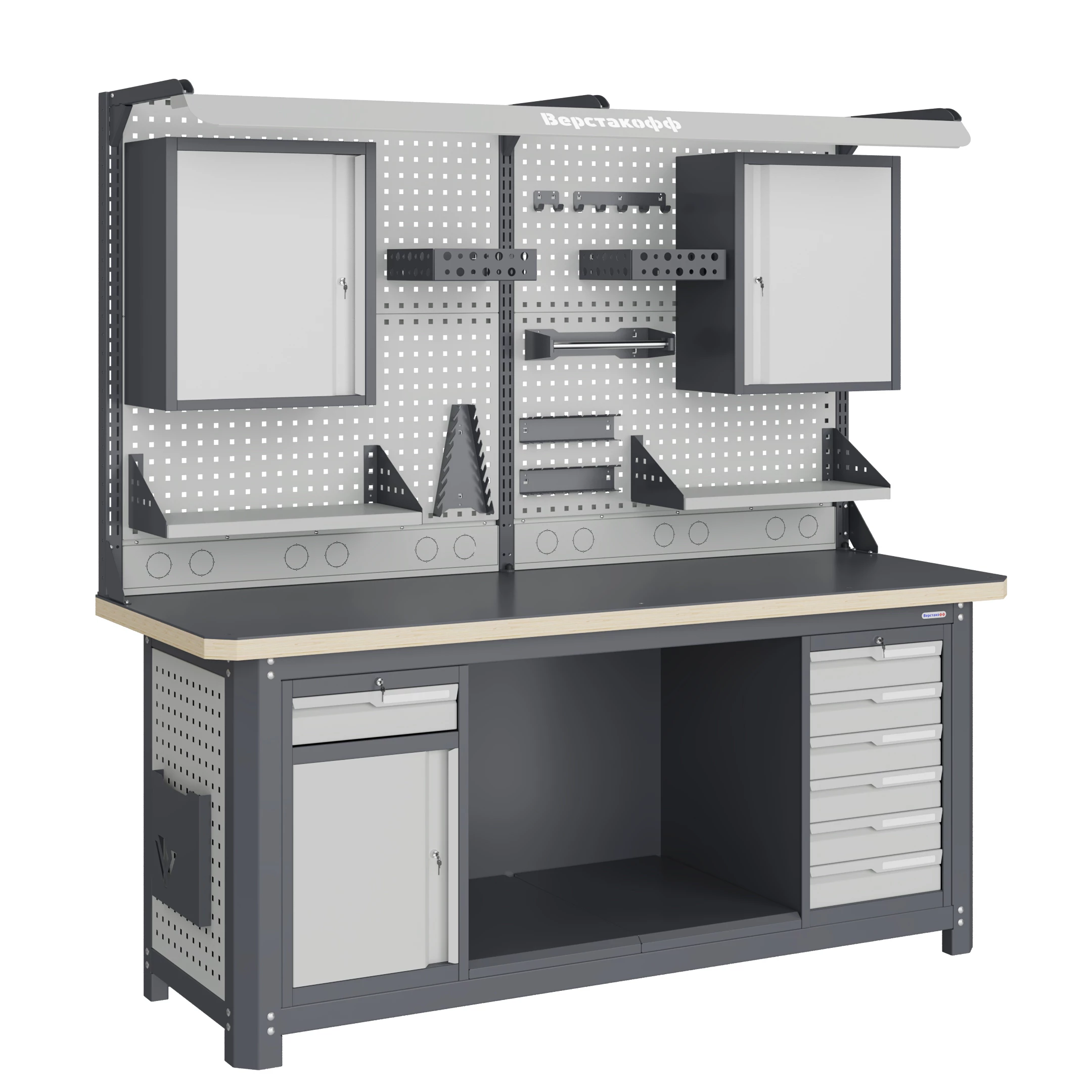 Экран (перфорированная панель) верстака выполнен с квадратной перфорацией 12х12 мм с шагом 38 мм для установки крючков, держателей и других аксессуаров. Экран крепятся к столешнице с помощью специальных кронштейнов. Максимальная масса груза, равномерно распределенного по поверхности экрана, составляет 71 кг.