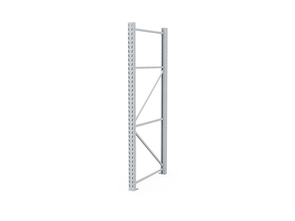 • Рама стеллажа состоит из двух стоек Р100х2,0 мм, комплектов диагональных и горизонтальных связей, подпятников (для анкерного крепления к полу) и крепежа