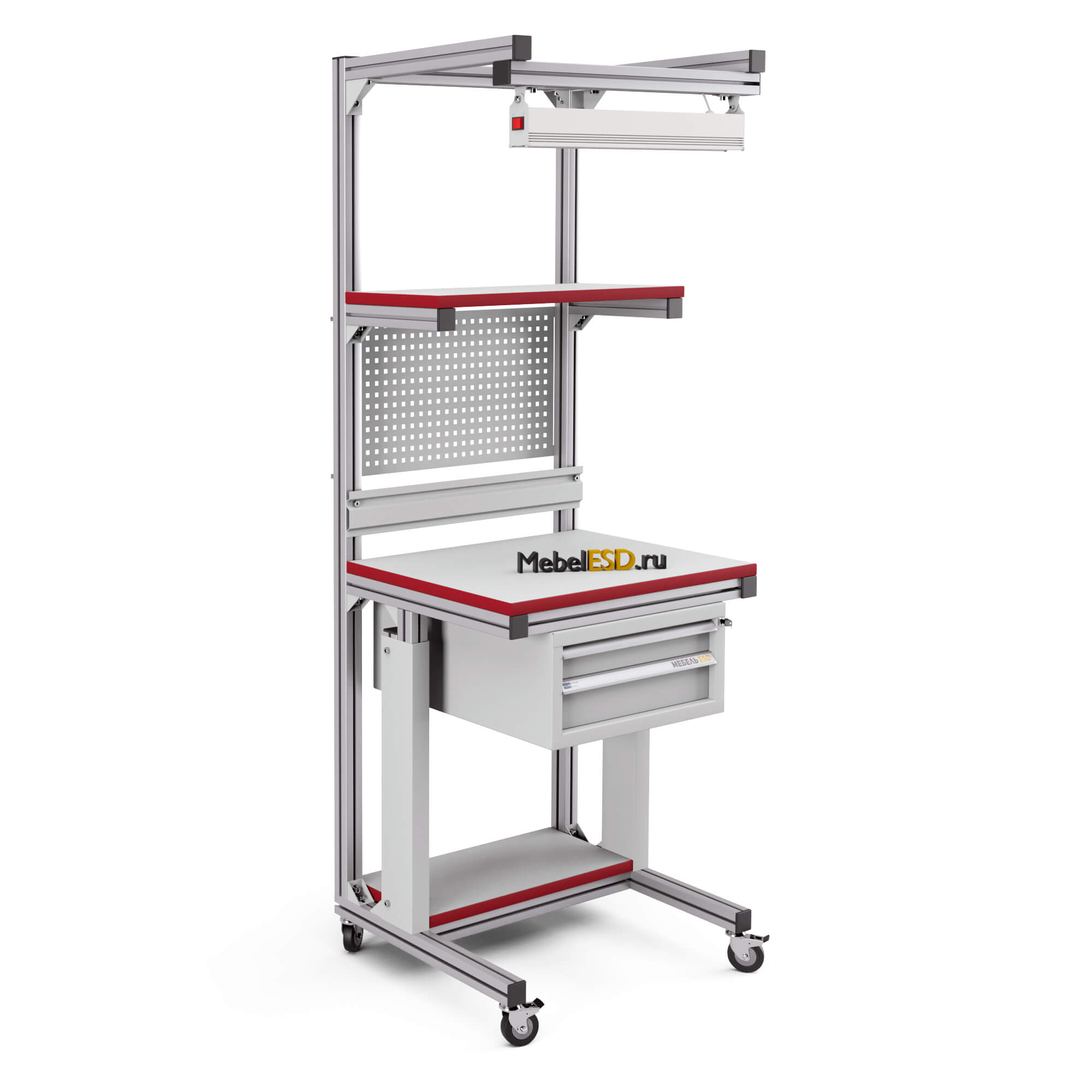 Стойка подкатная ремонтная из конструкционного профиля СР-КП является мобильным рабочим местом с возможностью перемещения оборудования и принадлежностей в рабочей зоне. Стойка оснащена: перфопанелью, инструментальной полкой с возможностью регулировки по высоте, нижней полкой, планкой для крепления лотков, подвесной металлической тумбой на 2 ящика, комплектом освещения светодиодным КОС-КП, четырьмя колесными опорами, две из которых с механизмом фиксации. Высота стойки — 1950 мм, ширина — 700 мм, глубина — 550 мм.